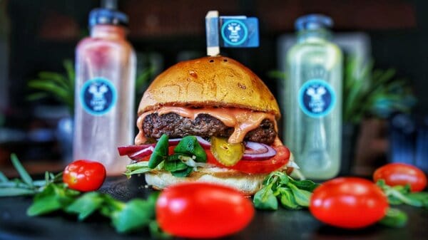 Buła maślana, wołowina lub kotlet wege, sałata, pomidor, cebula czerwona, ogórek kiszony, sos autorski