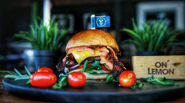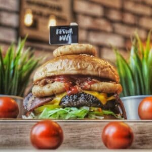 Buła maślana, wołowina lub kotlet wege, sałata, pomidor, cebula czerwona, ogórek kiszony, grillowany bekon, ser cheddar, sos autorski
