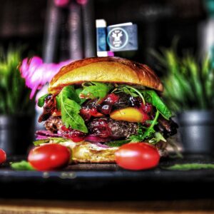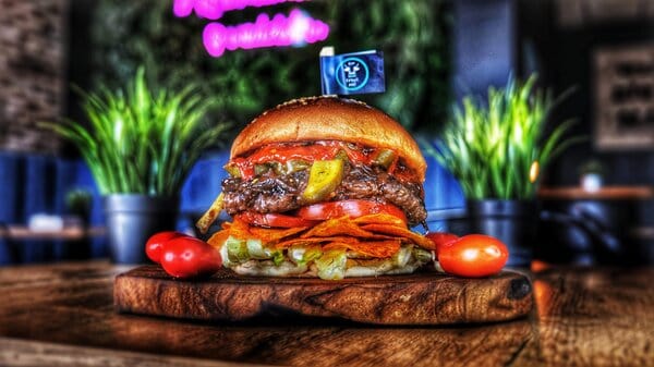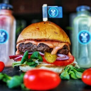 Bu艂a ma艣lana, wo艂owina lub kotlet wege,聽 sa艂ata, pomidor, s艂odki og贸rek, jalapeno馃尪, karmelizowana cebula, chipsy LAYS, sos czosnkowy, sos ostry馃尪