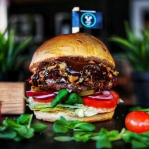 Bu艂a BRIOSZKA, 2x 115g Wo艂owiny w wersji SMASH, og贸rek PIKLOWANY, cebula czerwona, cebulka PRA呕ONA, 2x ser CHEDDAR, 2x grillowany BEKON, papryczki JALAPENO, majo, sos BBQ, sos SRIRACHA聽馃憞馃憞馃憞